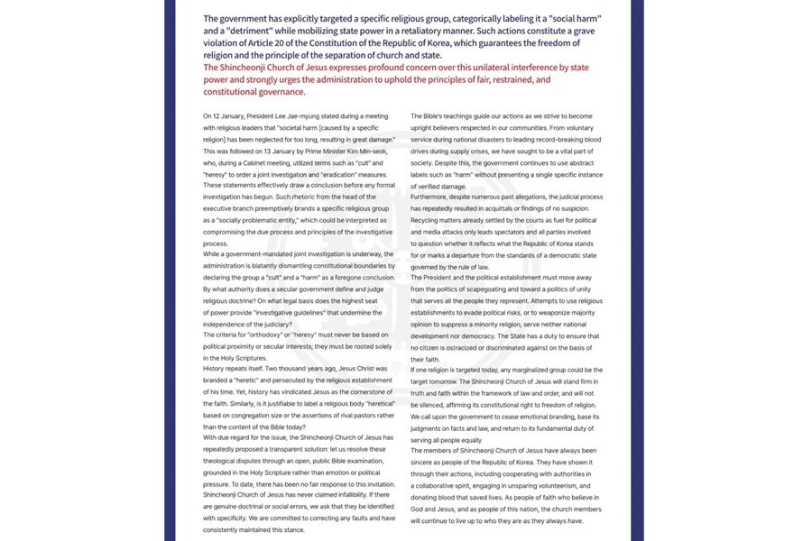 Politicians and certain media outlets must stop exploiting Shincheonji Church of Jesus for political contention. The Joint Investigation Headquarters must conduct an impartial investigation. Shincheonji Church of Jesus expresses deep.