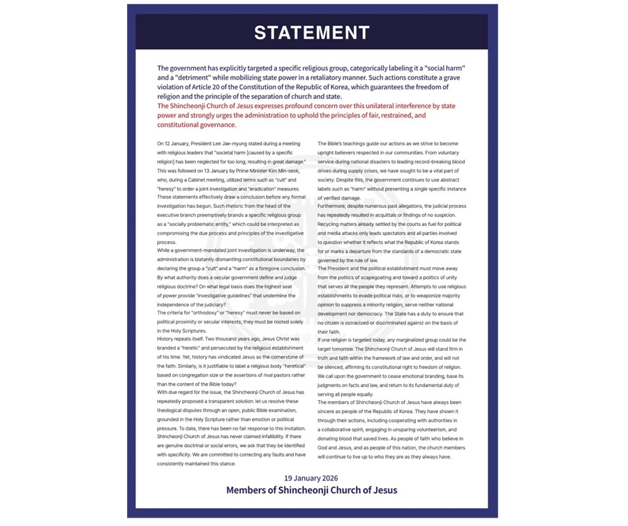 If one religion is targeted today, any marginalized group could be the target tomorrow. The Shincheonji Church of Jesus will stand firm in truth and faith within the framework of law and order, and will not be silenced, affirming its constitutional right to freedom of religion. We call upon the government to cease emotional branding, base its judgments on facts and law, and return to its fundamental duty of serving all people equally.
